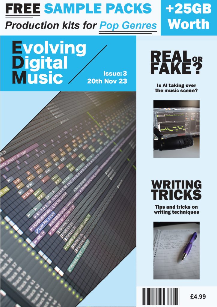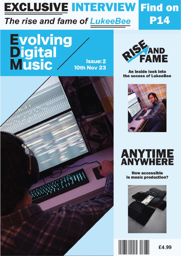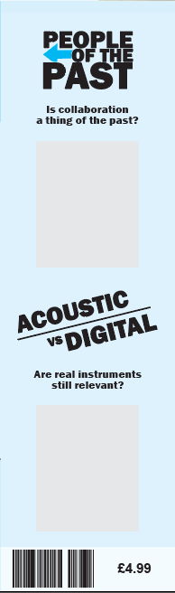 A diagonally placed crop has been placed on the top left and bottom right corner of the main image. The angle was determined by the line used in the masthead to create continuity throughout the composition. Once again, the upwards angle has been used to connote the evolving side of the digital music production.