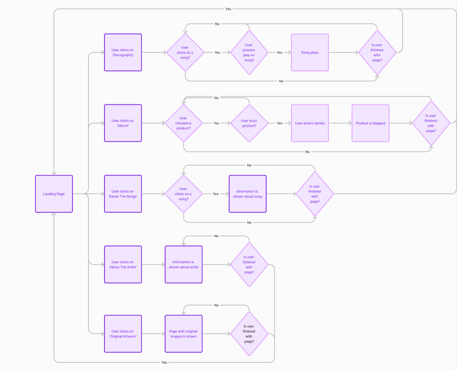 There are only 3 pages out of 6 where the user does not have to make a decision once on the page (apart from choosing to leave it) which are the “About The Artist” page and the “Original Artwork”. This is because these only show one piece of information, or a small amount that doesn’t need to be sectioned up. “Discography”, “Merch”, and “Song Inspiration” require up to 2 decisions as these allow the user to first choose a song or product, then proceed to listen, add to basket, or read about it.