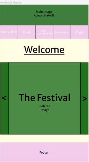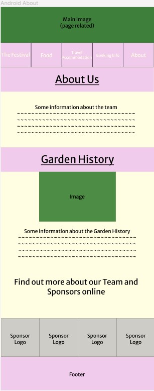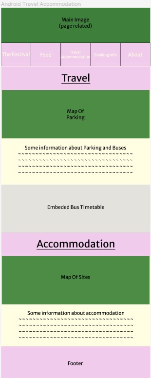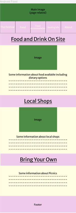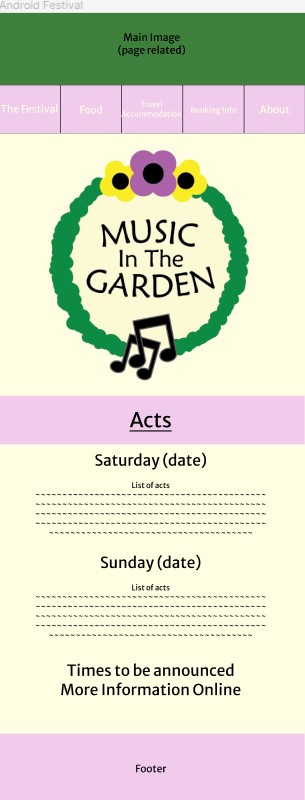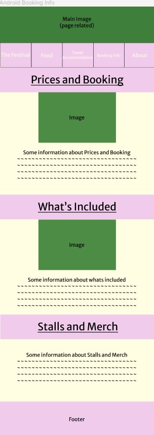 The festival’s main page is heavily visual, with textual information being largely cut out. With around 80% of users saying they download the app after viewing the online site, it felt unnecessary to include as much information as the online version does. The overall structure is rather similar, with it showing the logo and the acts, but general information such as the festival background and “Why you should come” section has been removed and replaced with “More Information Online”. This allows pages to be straight to the point with specific information. If a user was to be using this app on the go and around the festival, they would not need to know information on why they should go, but act times and dates would be extremely helpful so they can plan their day around those and easily know where they need to be.