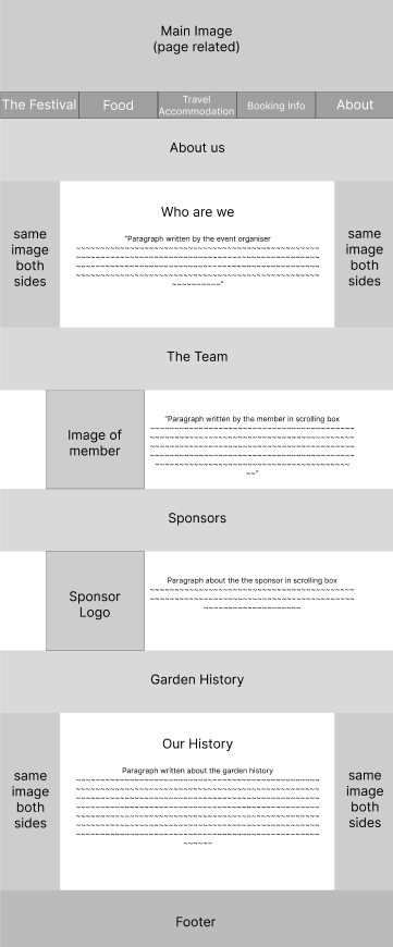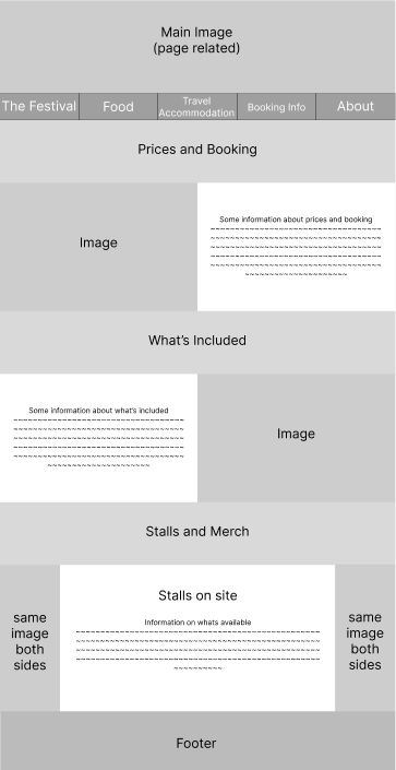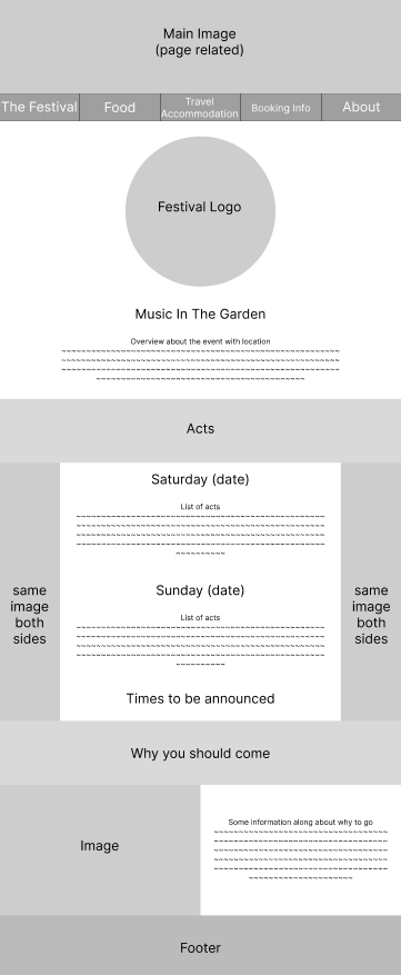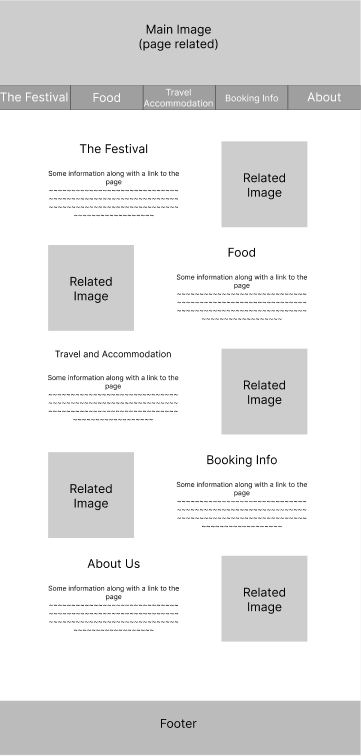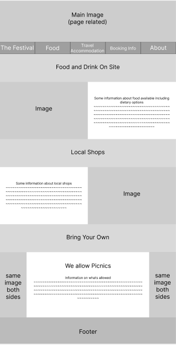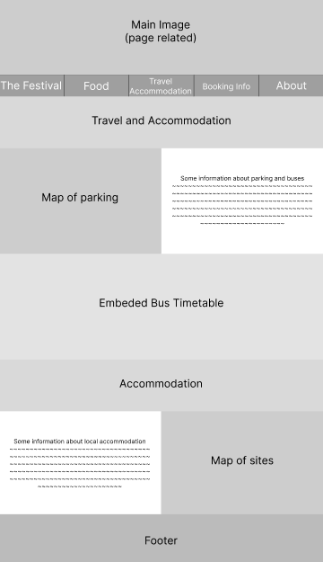 To make it as easy to navigate as possible, an options bar is at the top of the page with 5 simple page names. This reduces the chance of confusion or getting lost in the site, as there are only 5 pages that are clearly labelled. One problem that might need to be addressed, is that the opening page is not accessible through that bar. I felt this was not needed as all it did was give the same 5 options as the options bar. The home page could actually be removed, with The Festival instead being the main page, as this would reduce the amount of steps needed for a user and provide 5 straight to the point pages instead.