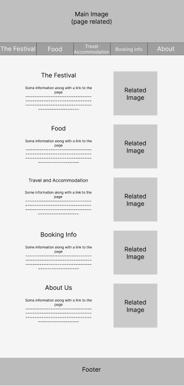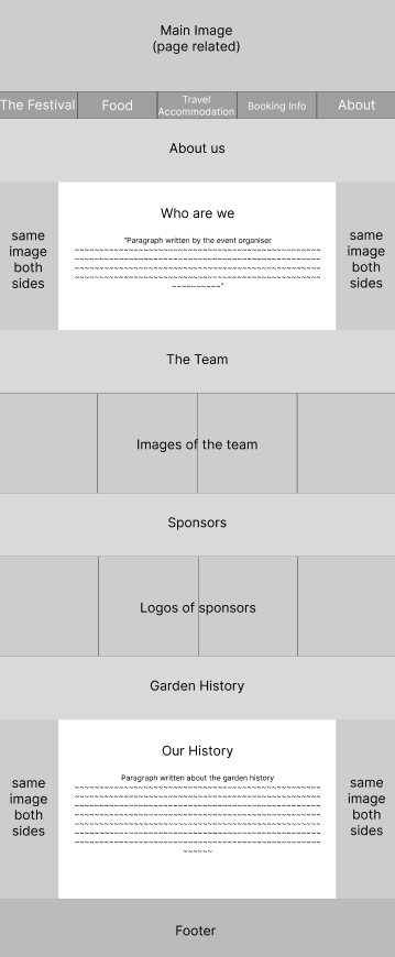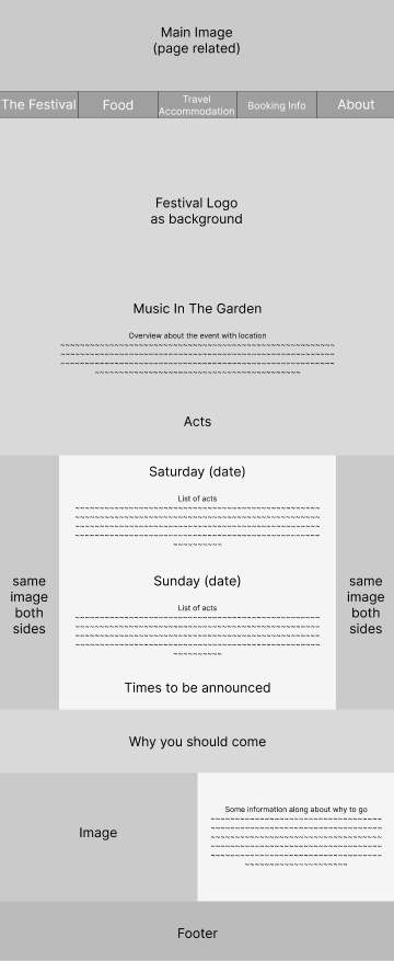 On the festival page, the logo was planned to take up the top of the page with an overview of the festival placed on top of the lower half. This was to give an interesting background to the section, but with the logo not being designed yet, it could end up severely clashing with the text. To prevent this, the logo has been changed to a smaller section positioned above the text now, giving more than enough space for both elements. Although a larger logo could have looked better, it would’ve taken up too much space that could be used for other elements.