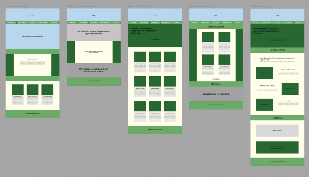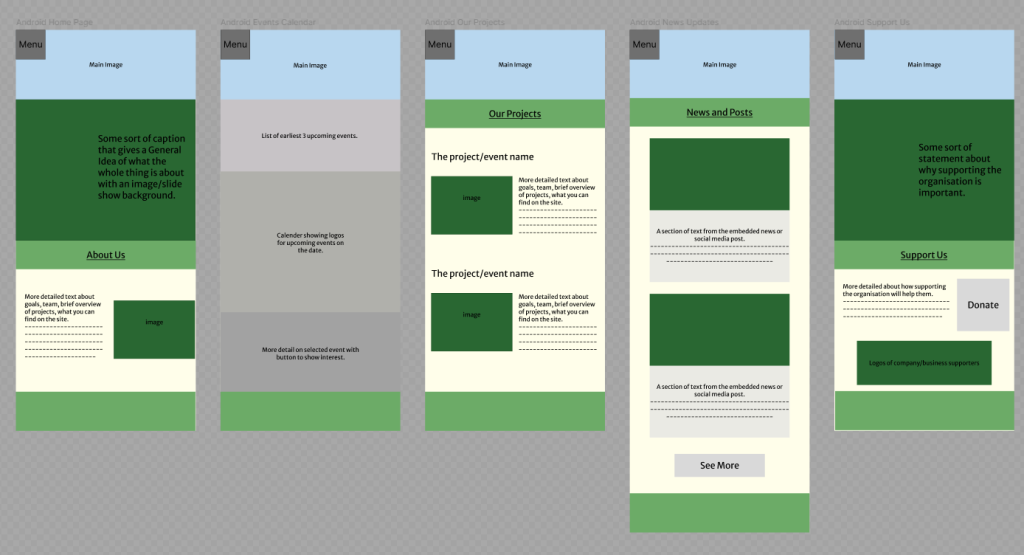 Basic functionality has been added such as the ability to change page, view a project, view an event on the calendar, and view a post from the “News and Updates” page. These also have buttons at the bottom of the page to allow the user to navigate back to the original page. It’s not necessary as there is the bar at the top of the page, but it’s another option for the user to use once they’ve scrolled to the bottom of the page. This means you can get an idea of how to navigate the website and what each extra page will roughly look like. The general colour palette has also been added, with the darker greens used as placeholders for any images that would be used.