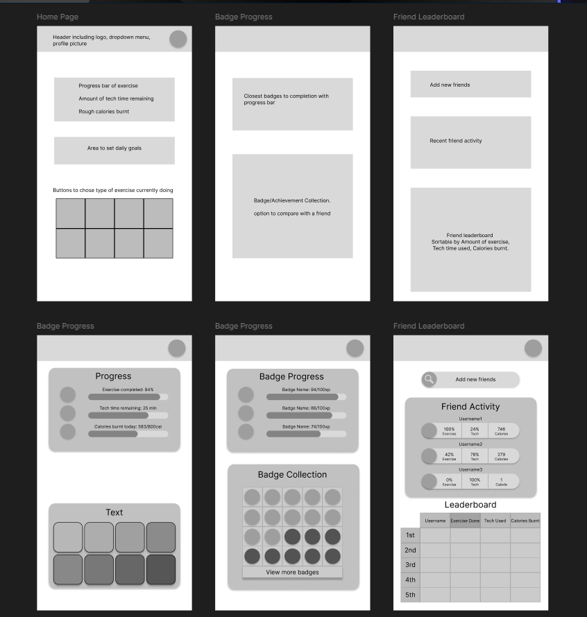 The first version was a basic low-fidelity design, as this allowed other group members to mention possible ways to lay out sections and include different things. No section had any real visuals in them but gave a rough overview of possible page layouts. These were then incorporated into a mid-fidelity design that gave a better idea of features which lead to badge designs being created by other members of the group.