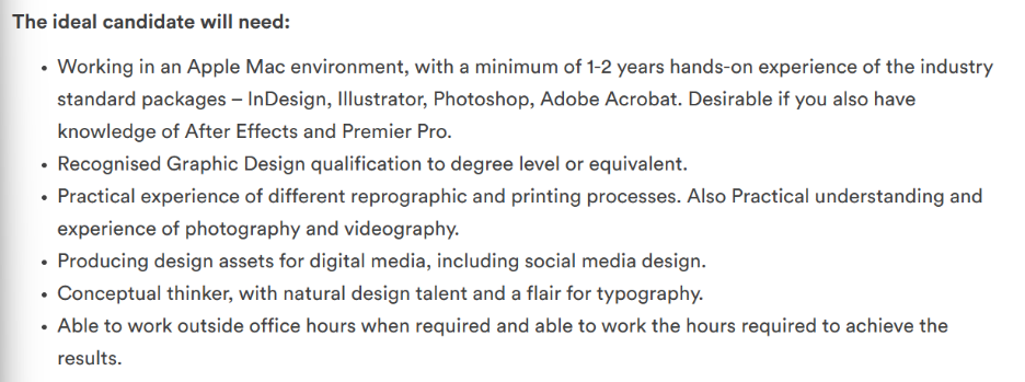 Bernardo’s is also a charity organisation like Groundwork, so although I could not find a Groundwork application this should be relatively similar and seems like what I was expecting. Seeing as this role has a big focus on Adobe Creative Suite applications, this fits well into my experience from both university and home projects. With them also finding an experience in photography beneficial, this works well with me having an A-Level in photography too and a decent quality camera already.